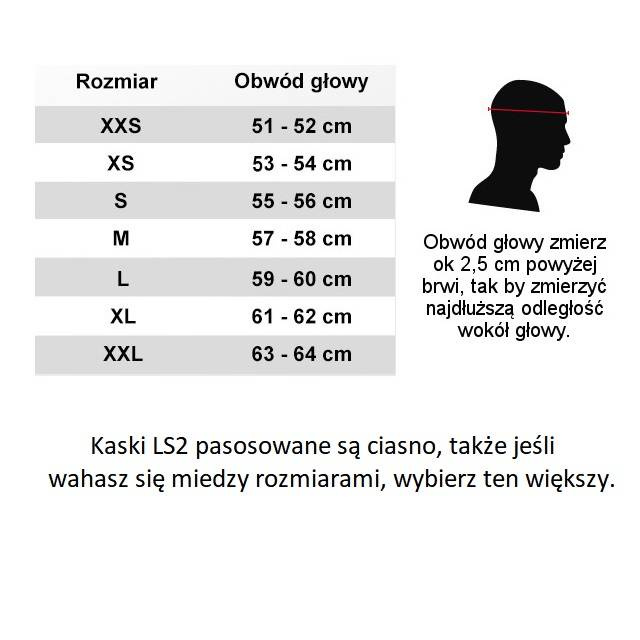 Zakres rozmiarów głowy (orientacyjnie)XS: 53‑54 cm, S: 55‑56 cm, M: 57‑58 cm, L: 59‑60 cm, XL: 61‑62 cm, 2XL: 63‑64 cm, 3XL: 65‑66 cm