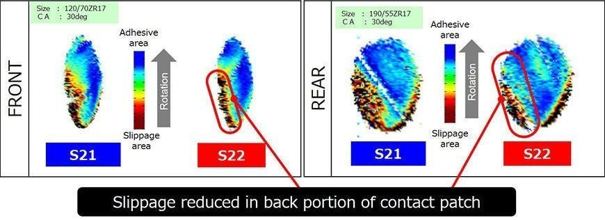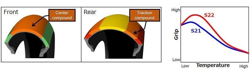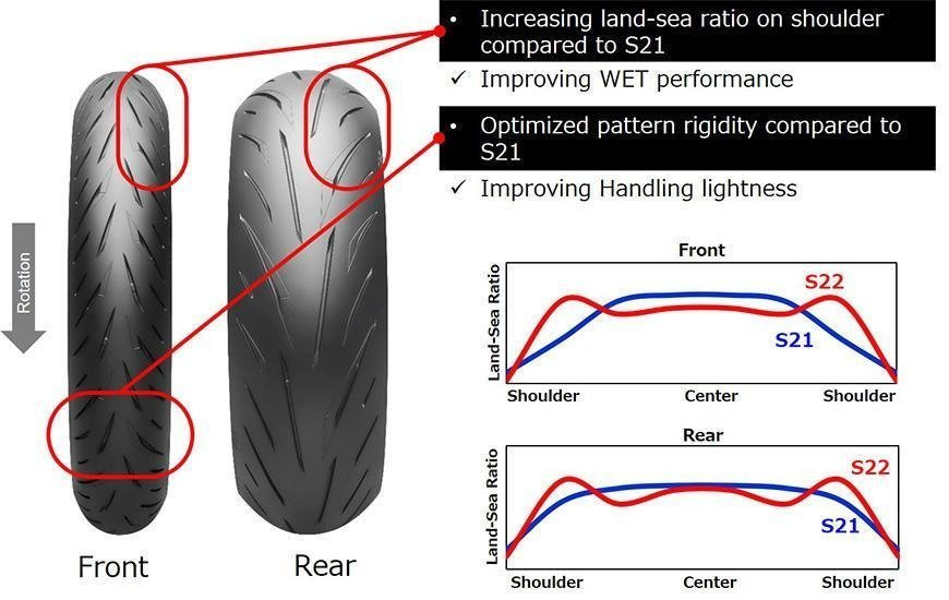 Opony motocyklowe Bridgestone S22 łączą w sobie wysokie osiągi z bezpieczeństwem i długą żywotnością. Zaawansowana konstrukcja z wykorzystaniem technologii Mono Spiral Belt (MSB) oraz High Tensile Super Penetrated Cord (HTSPC) zapewnia doskonały kontakt z nawierzchnią bez względu na kąt nachylenia. Gwarantuje to większą przyczepność w każdych warunkach. Nowa mieszanka z technologią "Silica Rich" wraz z opatentowanym przez Bridgestone polimerem NanoPro-Tech™ zapewniają doskonałą przyczepność na mokrej nawierzchni oraz przy niskich temperaturach. Rozwiązanie to daje znakomitą przyczepność tuż po starcie podczas rozgrzewania opony, bez szkody dla trwałości. Na tylnej oponie zastosowana została technologia trójwarstwowej mieszanki (3LC) co poprawiło przyczepność na suchej nawierzchni, stabilność w zakrętach oraz dało większą żywotność.